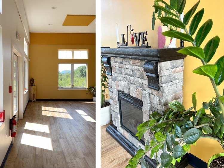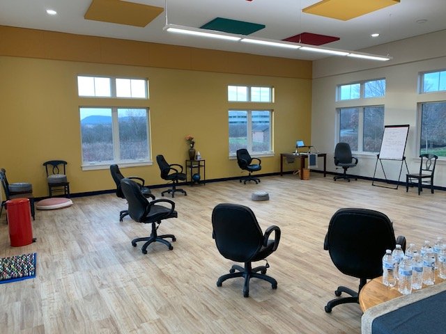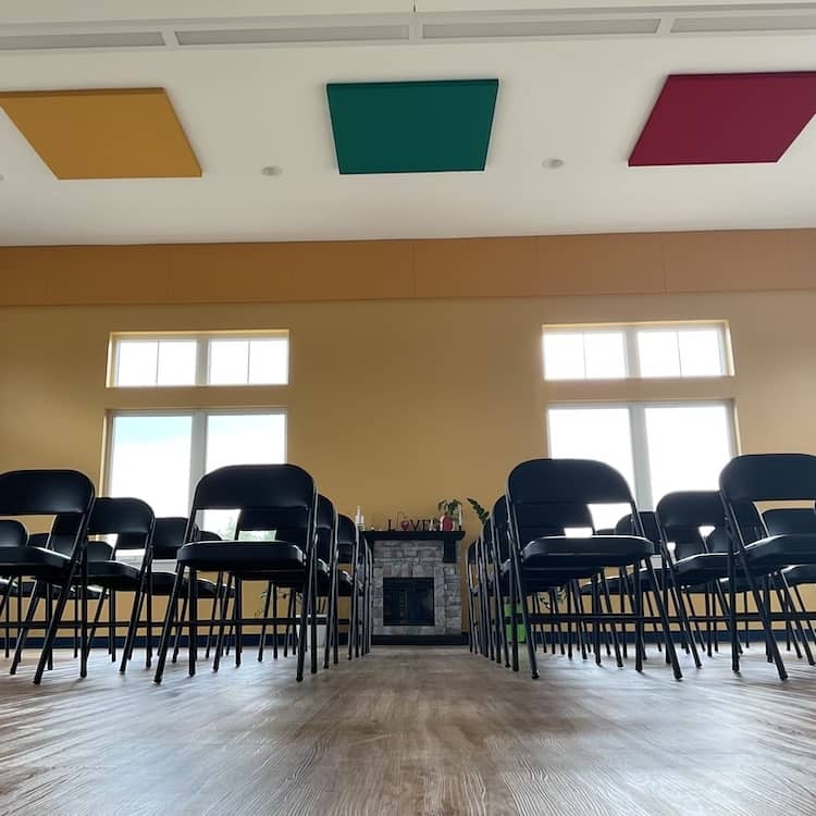 We have been blessed to rent from VWC consistently over the last 1.5 years. The studio space fits our current needs really well and we love the high ceilings, open feel, and large windows that overlook the meadow that we can open and close as needed. The studio itself is very quiet and the acoustics are great for chanting. There is also a beautiful outdoor space that we love to rest in during workshop or teacher training lunch breaks and the two clean bathrooms close to the studio are very convenient.